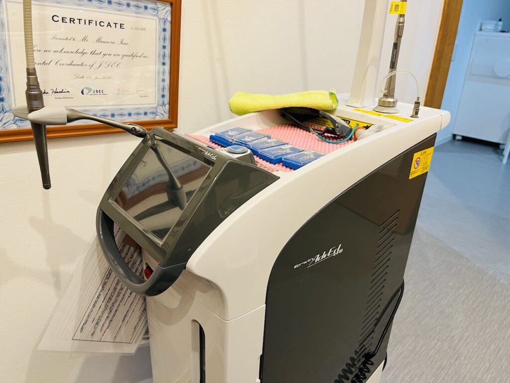 根管内や歯周ポケットなどの殺菌消毒、知覚過敏処置、粘膜の切開(通常のメスによる切開よりも治りがはやい)、抜歯後の止血、メタルタトゥー(金属による歯茎の黒ずみ)やメラニンの蒸散のなど幅広い用途があります。
